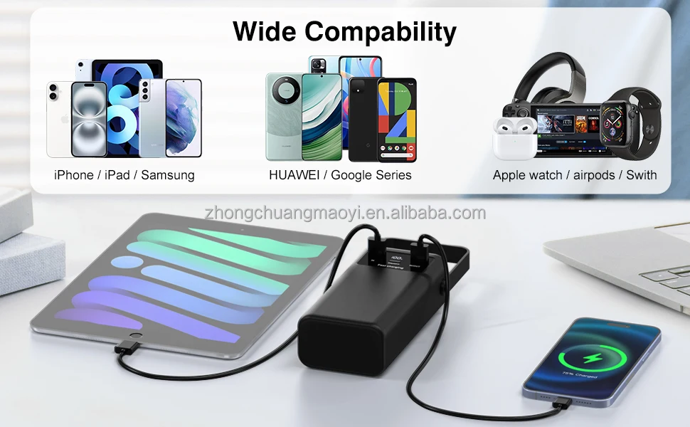 The USB C portable phone charger has 4 built-in cables (Type-C, USB-A, iOS, Micro) and 4 charging ports (USB A output 1/2, Type-C input 1, and Type-C input and output 2), compatible with almost all types of smart devices on the market such as iPhone 16 15 14 13 12 11 Series, XR, XS Max, Samsung S24, S23, S21, S21, S20, A52, A32, Z fold series, Z flip series, and Google Pixel series, and other Android phones, iPad, tablets, etc.